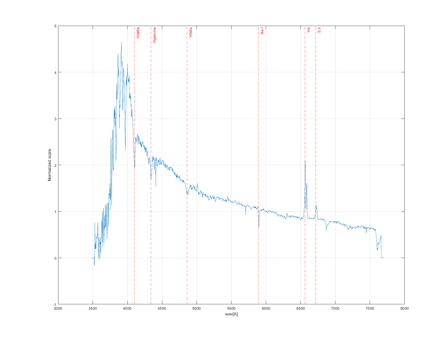 Après quelques discussions sur le forum Astrosurf (http://www.astrosurf.com/topic/152258-a ... 82/?page=4) concernant la région communément appelée M82-F (MNRAS 326, 1027–1040), j'ai (enfin) pu profiter de quelques heures pour jouer avec l'Alpy installé sur le newton de 400. Les spectres de M82 sont en général une superposition de spectres stellaires et d'émission Ha, N II, SII. Le profil ci-dessous n'est pas corrigé de la réponse instrumentale, je ne pensais pas avoir suffisemment de flux pour le justifier, en fait j'aurais dû quand même prendre une étoile de référence pour le faire