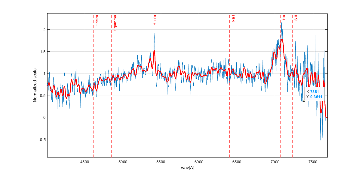 Nice spectrum Simon ! Your 400mm aperture "light bucket" is working well. My H alpha line looks wider even allowing for the difference in resolution but I think that might be due to the Telluric bands either side of the red shifted H alpha which I removed in my spectra. Are the Tellurics left in your spectrum ?