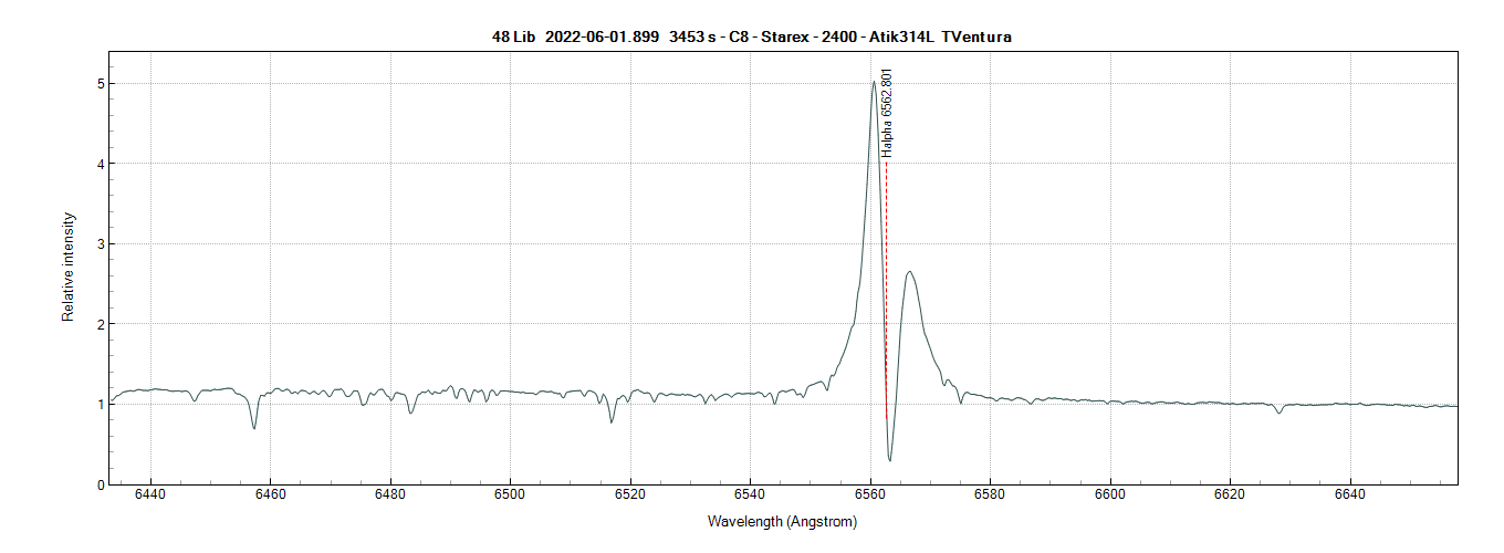 Hello everybody. After some time spent waiting for a time to allow us to play with ghosts, I finally had the opportunity to observe a star and derive the spectrum of her. The star is the 48 Lib class B5IIIp_sh. Already on the star class there would be a lot to say. If I find the time to play the little astronomer I will give you more information. This star has the particularity of having a deep central absorption and two strong emissions all centered on Halfa.