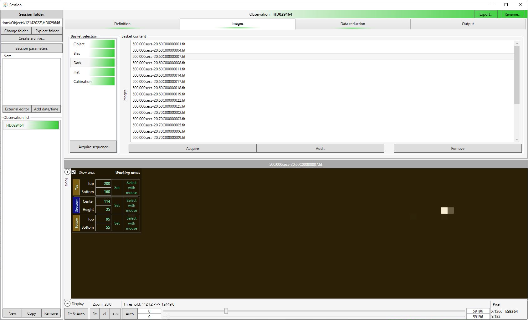 Screen shot 1 - Dark Frame - shows a hot pixel at 1266,182 @58364 value.