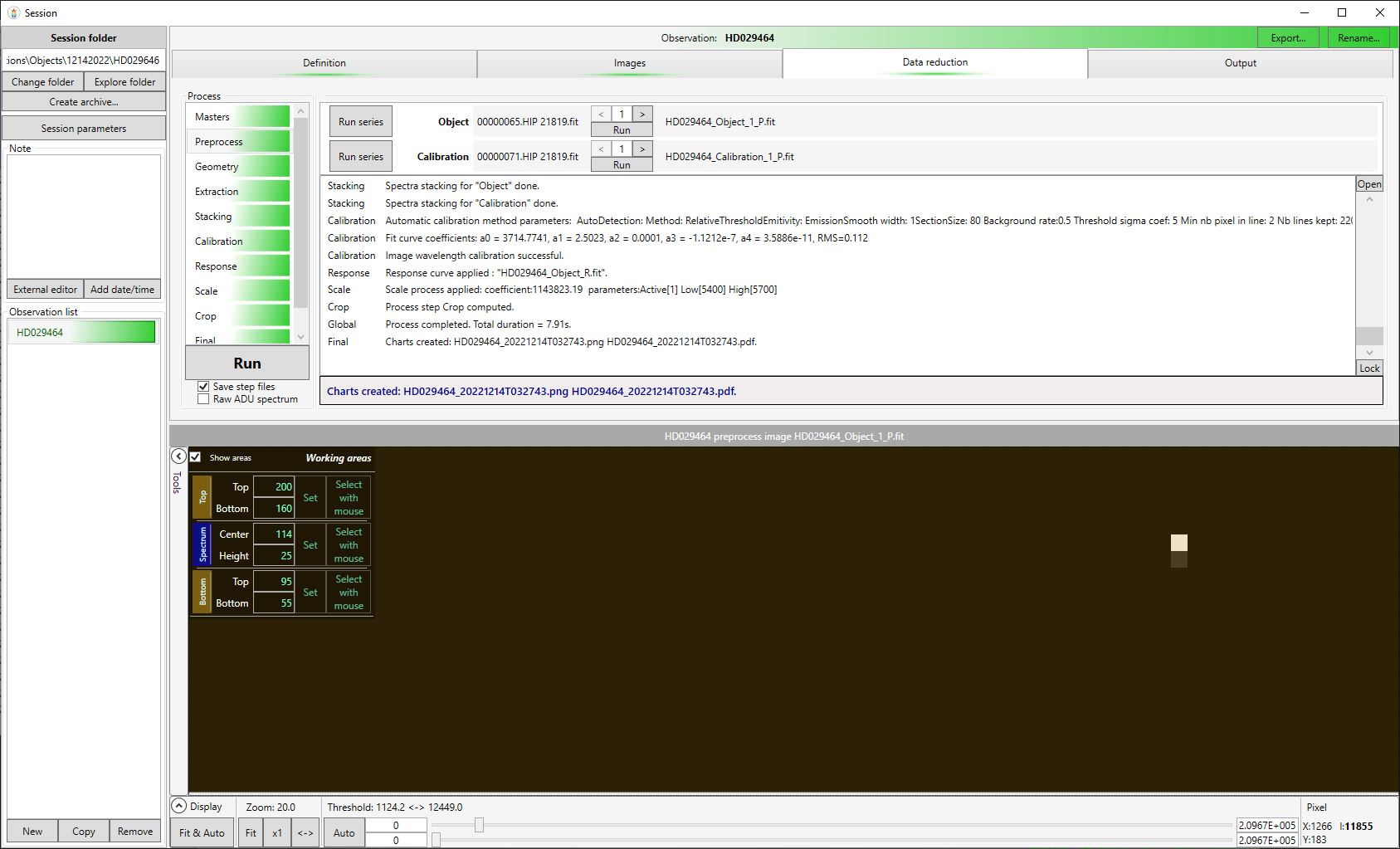 Screen shot 3 - Calibrated Image - shows TWO hot pixels, at 1266, 182 and 183 values 11855 and 2838. That shows that the image hot pixel was not fully reduced and a new hot pixel was added.