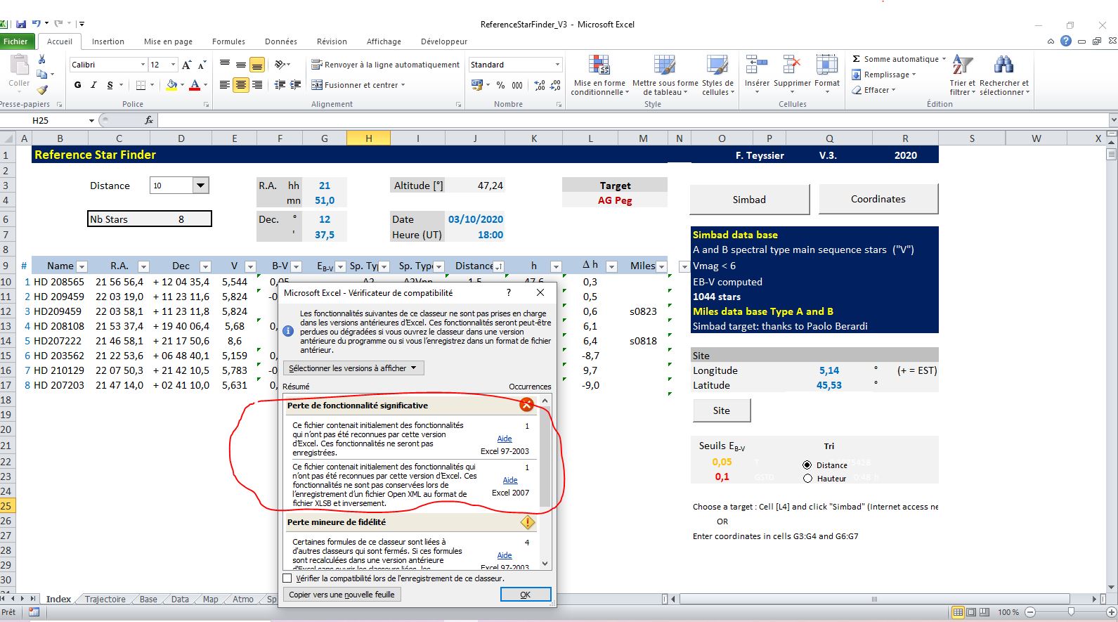 Suite aux observations de Hubert, je viens de faire l'essai de ReferenceStarFinder_V3 avec Exel Office 2010 (au lieu de Office365) sous Windows10: j'ai toujours le même problème: pas de changement de l'Altitude après modification de l'heure UT et validation de la frappe (alors que l'altitude varie bien après changement de l'AD, DEC ou Latitude). Or j'ai lancé le vérificateur de compatibilité d'Excel 2010, qui indique deux pertes significatives de fonctionnalités (copie jointe):