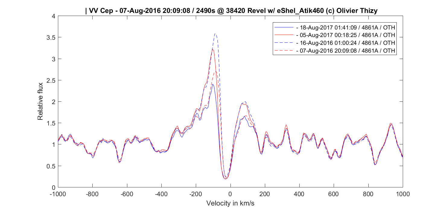 I also seem to see a decrease in Halpha but I am careful as variations occured outside eclipse too. For exemple spectra taken also ten days apart with last year/this year for comparison: and it is even less obvious on Hbeta: I guess the event will take a very long time, with a "noise" level fairly high from the hot emission source...