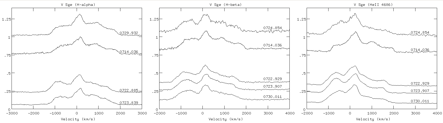 Continuum supposed to be at 1, but scaled to 0.05 for H-alpha, 0.12 for H-beta and 0.07 for HeII 4686 on the above graphs (and continuum is added to the phase in the interval of [0..1]).