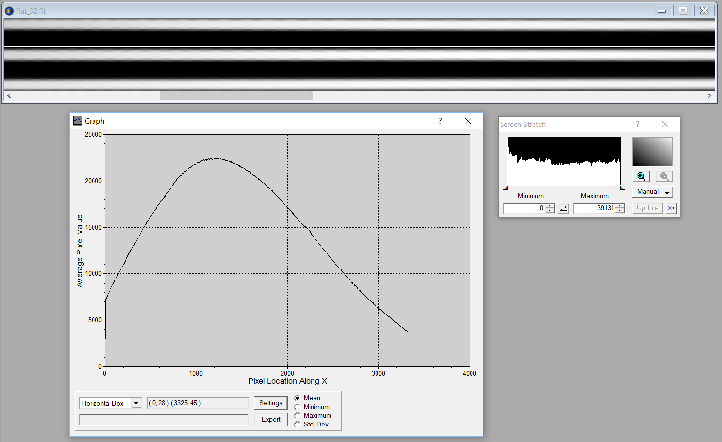 Here is the profile in the cross dispersion direction for flat _32.fit. The inter-order region is quite wide and very near zero so ISIS has done a good job of removing the inter-order background. and here is a profile generated in MaximDL - it is smooth, no ripple. With the eShel mode I always get ripple no matter what binning I use all the way from 8 (the minimum allowed) to 20. Larger than 20 and the orders either side start to get included.
