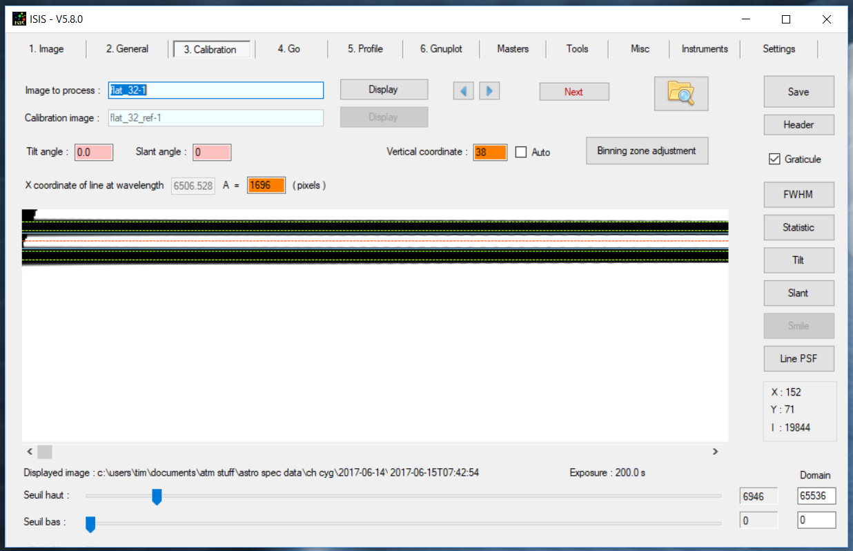 But before, it is important to verify that ISIS does not correctly find the trace of the orders. I recommend that you look the check.fit and check2.fit images and control the overlay of the trace found by calculation and the actual trace (select "Rotation test" before). Details are here: