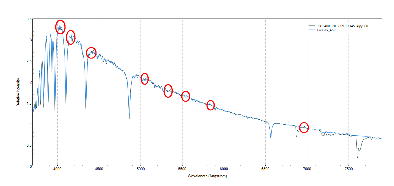 These small differences could be real. The Pickles spectra are typical averages for a particular spectral class. The details in the actual spectrum of a star will vary with metallicity, relative abundance of the elements. My comparison is with a professional measurement of the same star from the MILES catalogueMichel Verlinden wrote: Here is an example: Iota Cyg. The artefacts are indicated (red circles) .