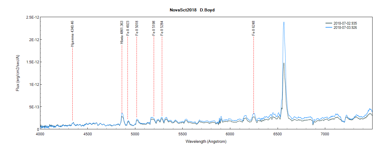 Bonjour à tous, placé le profil de la nova observé hier soir 04-07-2018 et une comparaison avec le jour précédent qui montre la variation de l'absorption du second P-cyg.