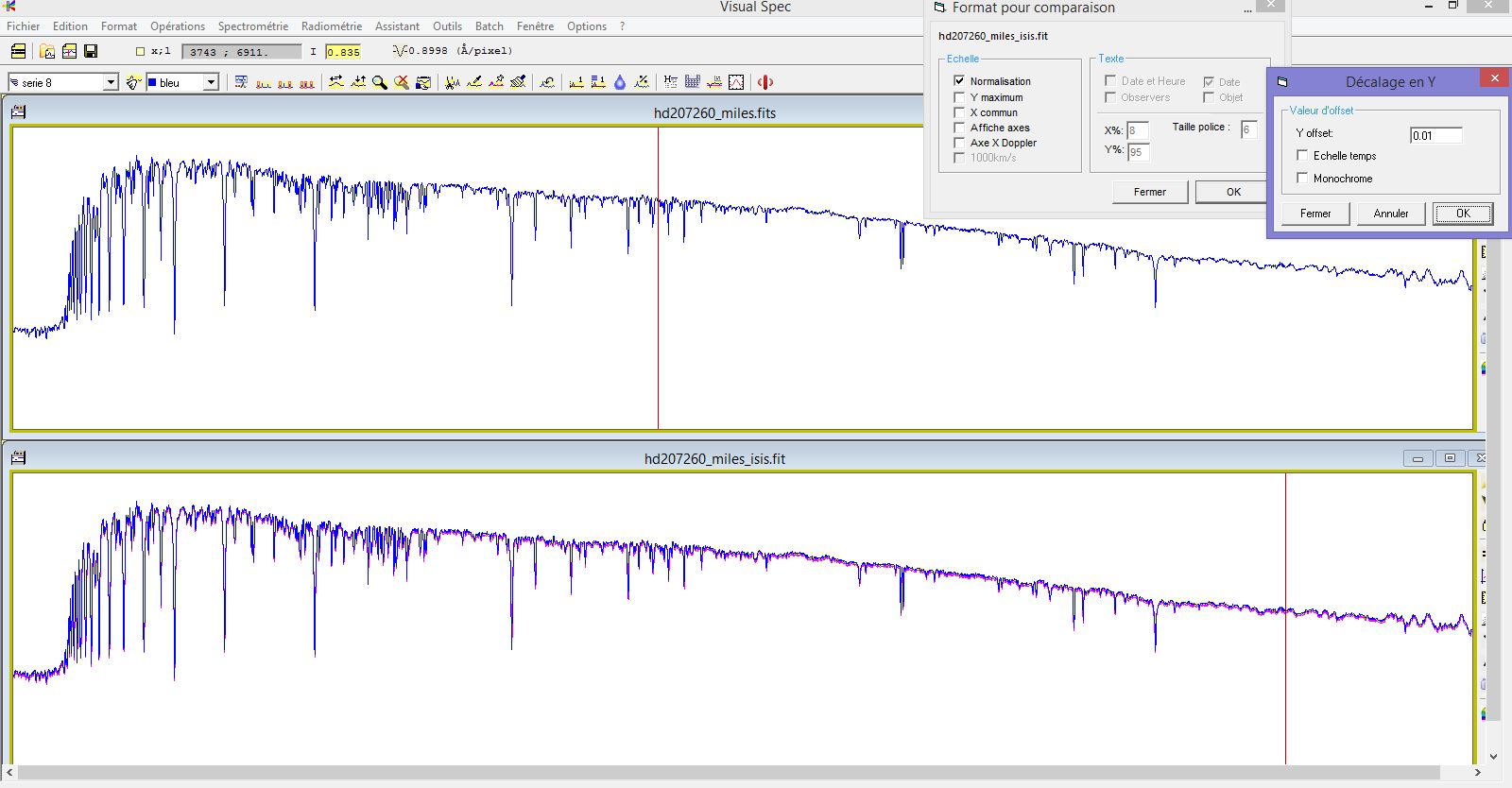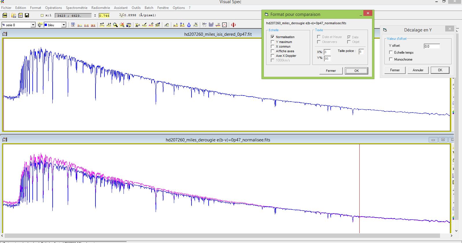 (with Y Offset=0.01 for readability): For the comparison between the profile “hd207260_miles_isis_dered_0p47” that you sent me and my profile “HD207260_Miles_derougie E(B-V)=0p47_normalisee”, there is a visible difference: It seems that with the same E(B-V)=0.47, the development operation performed is not identical.