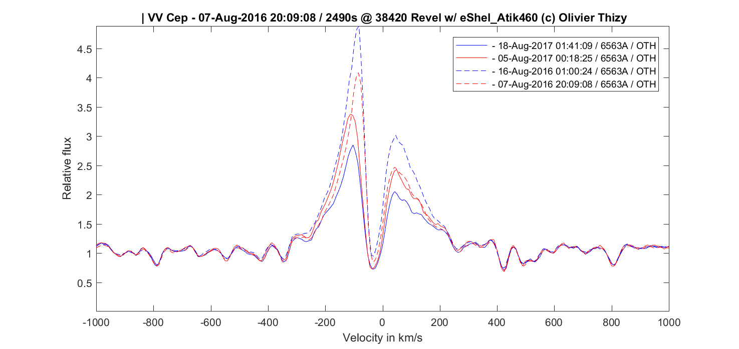 I also seem to see a decrease in Halpha but I am careful as variations occured outside eclipse too. For exemple spectra taken also ten days apart with last year/this year for comparison: and it is even less obvious on Hbeta: I guess the event will take a very long time, with a "noise" level fairly high from the hot emission source...