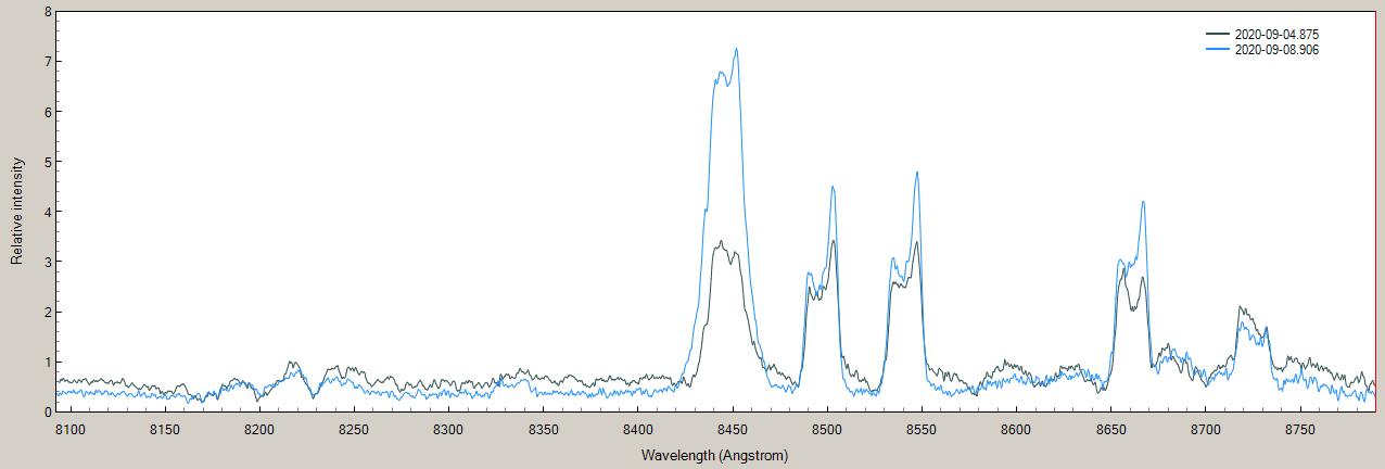 O I 8446 has doubled its height and EW ratio compared to Ca II IRT, and widened.