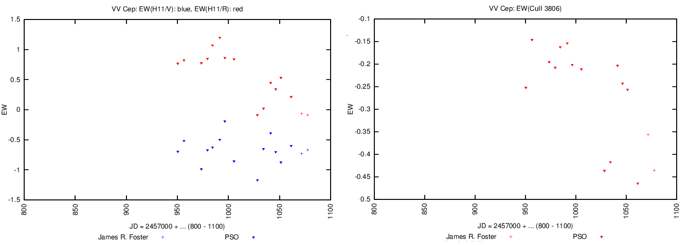 Now exploiting the suspect that Cu II 3806 should be more or less stable, using it to make before/after eclipse the EWs (H11/V) compareable - only for the V emission part. (For the R absorption component, I simply multiplied it by 4x constant - note that absorptions are already absolute.)