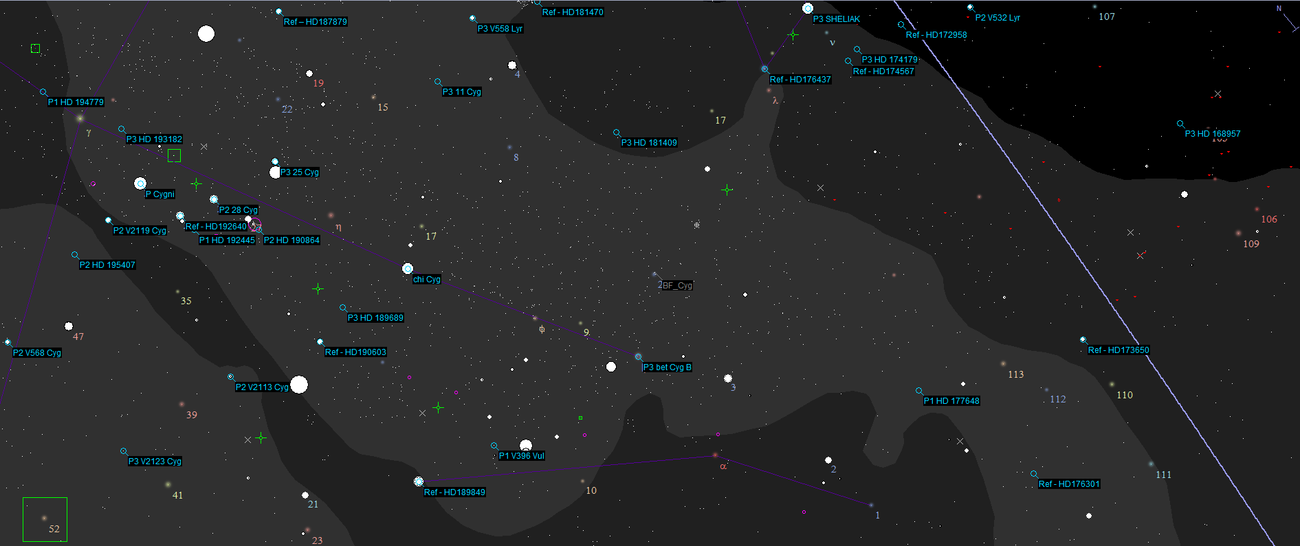 >>OTz>>For BF Cygni reference star, I would take a MILES star which is close by (the star marked 'ref' are the MILES ones; the P1/P2/P3 are Be stars with BeSS priority from last week); hd176437 seems a good & bright one: