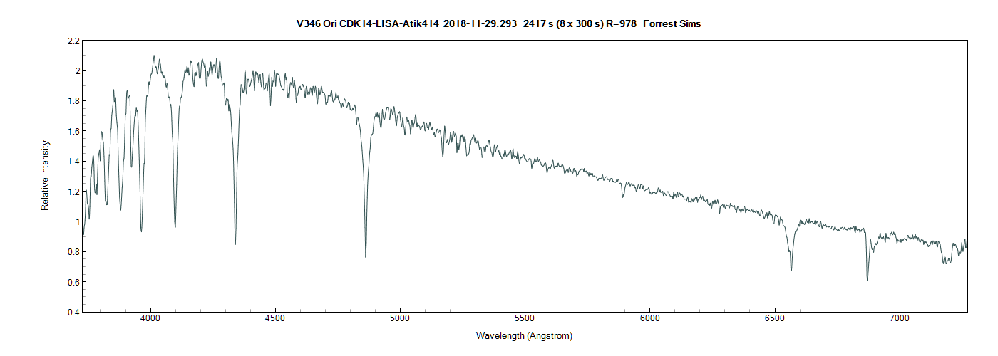 Here is a spectrum of V346 Ori taken with my LISA early morning on 2018-11-29 Arizona time. I was hoping for some exciting emission line like David saw on two of the other campaign targets. Looks like the same Halpha absorption as in Terry’s data from 2018-11-25. Just for curiosity I loaded the V346 Ori fits file into Rspec and checked to see which included Reference spectrum is the best match and was at first surprised to see that F02IV (Blue line profile) looks to be the best match. SIMBAD shows V346 Ori as an A8V. Rspec does not have an A8V for reference but the F02IV immediately follows A7V in the Rspec list. So not such a surprise:)