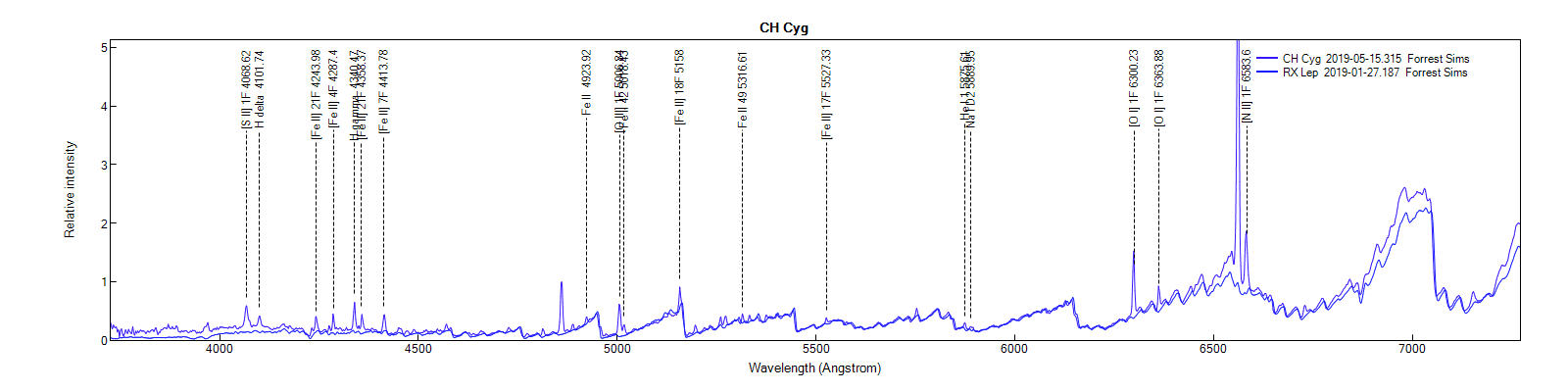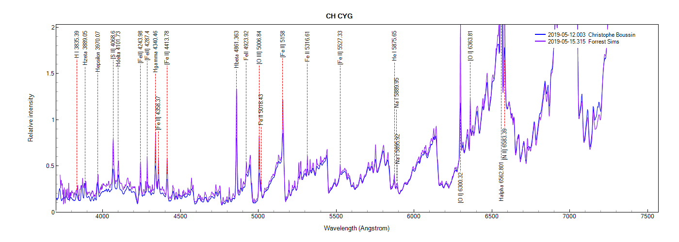 Just to highlight the effect of the resolution on the detection of spectral lines, here is a comparison of the Forrest Sims spectrum (LISA) of CH Cyg with mine (Alpy).