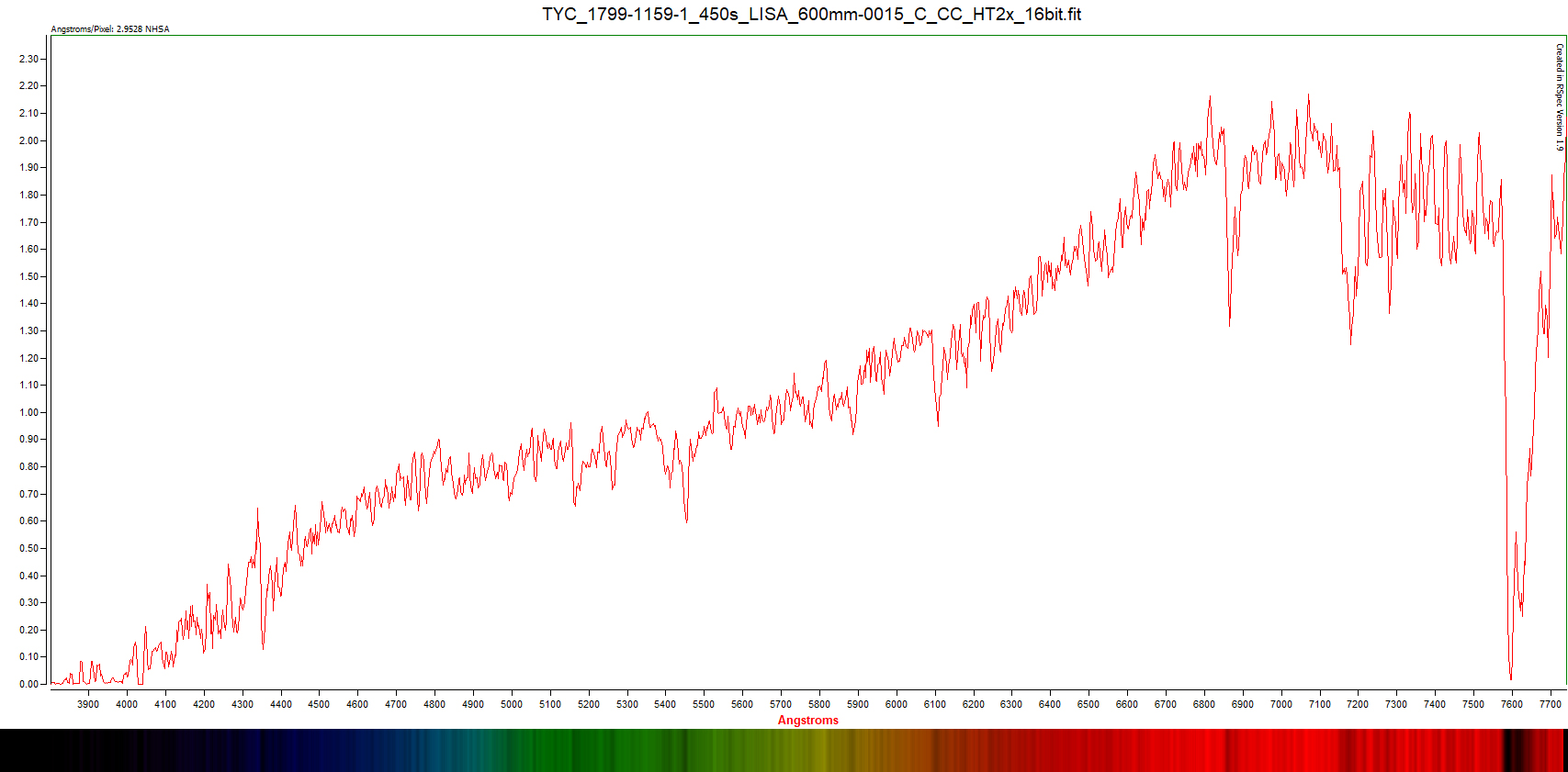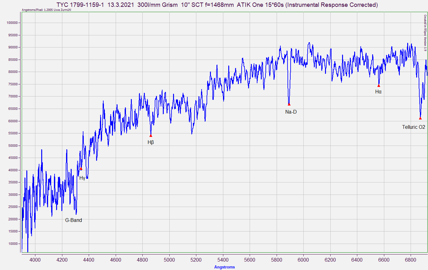 I managed to get TYC 1799-1159-1 yesterday night and made 15 images each 450s and processed the outcome into a spectrum. I tried to calibrate the spectra with the instrument response curve I have. Nor perfect but trying to learn more and more with time. Just started again with Spectroscopy so please excuse mein stümperhafter Versuch :o