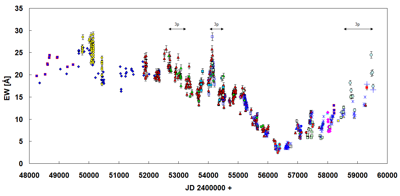 Since the Be-star is at present again (still) in its Be phase, there is the chance to observe the so-called "triple peak" in Halpha. This "triple-peak-phase" has been observable in the past twice (see: EW-Monitoring_triple-peak.png).