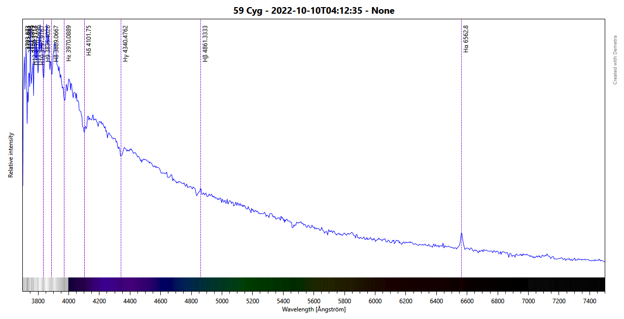 I moved to an apartment in downtown Snta Fe, NM which very light polluted. I have a small balcony off of my bedroom and decided to try getting some spectra with my Alpy 600 and a 6" Celestron SCT Scope with a f/6.4 reducer and an Atik Infinity monochrome camera- using Demetra for data reduction. Attached are resuts of observations that I made on October 10, 2022. I am encourged and plan on persuing my interest in spectroscopy. One might see that I do have an interest in Be type stars.