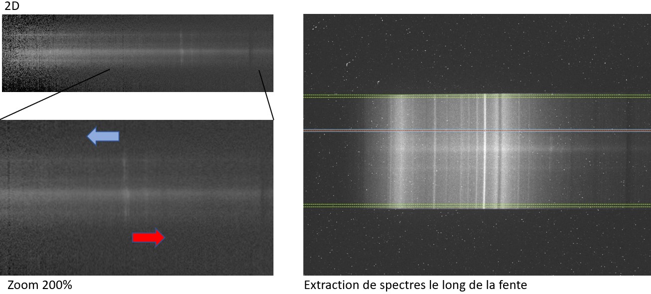 En inspectant le spectre 2D on devine le blueshift/redshift des raies en émission de long de la fente, de part et d'autre du bulbe de la galaxie: on détecte sa rotation !