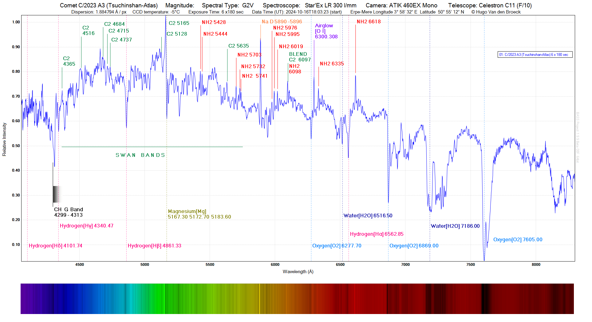 Here is the spectrum of the comet, made with a Star’Ex LR 300. Description at the top of the graph.