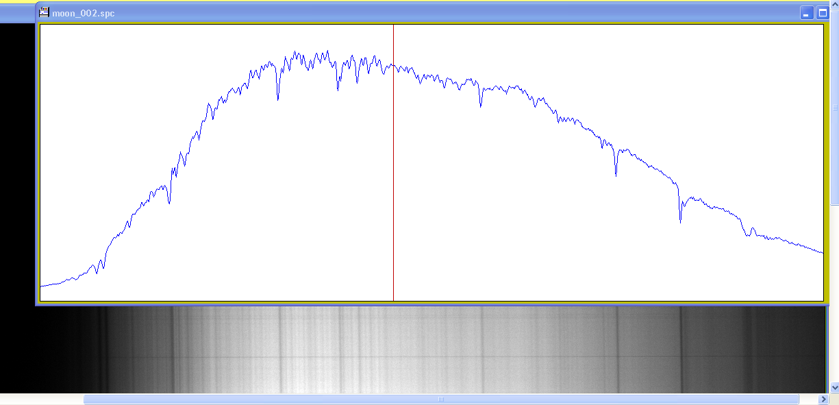 For comparison attached are a couple of full size screen shots of raw spectrum images and binned spectra for moonlight and the calibration lamp from a few nights ago. I have measured the FWHM of a lamp line in the blue which gave 2.9 pixels or 18.8 um which is as expected for a well focused spectrum (I am using a special 18um spectrophotometric slit with an 18 um slit rather than the standard 23um)